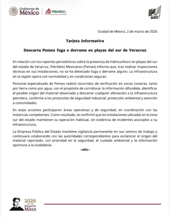 En un comunicado fechado el 2 de marzo, Petróleos Mexicanos aseguró que, tras inspecciones en sus instalaciones del sur de Veracruz, “no se ha detectado fuga o derrame alguno” y que su infraestructura opera con normalidad.