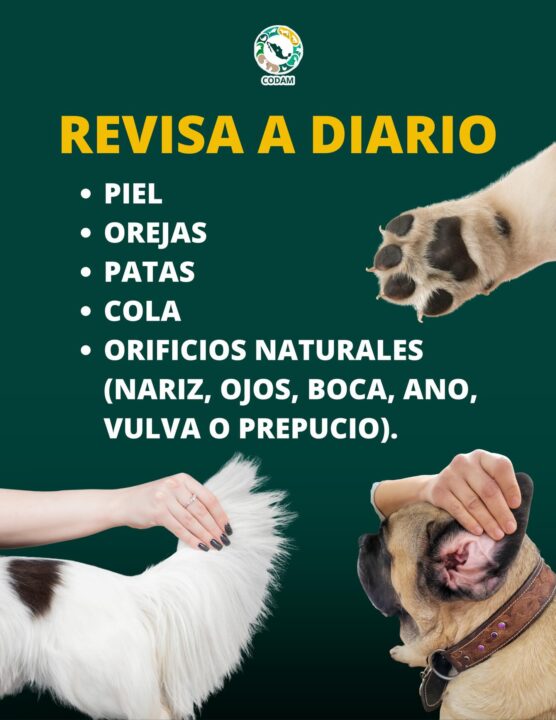 - Revisar diariamente la piel de las mascotas, especialmente orejas, patas, cola y zonas húmedas