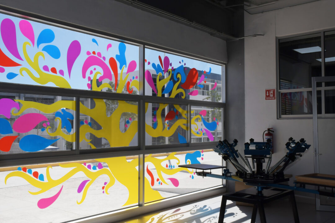 “Es una exploración de materiales que se hace en la materia de Tipografía 2. La idea es intervenir ventanales con vinil de colores para hacer diseños de gran formato que vistan el espacio y, al mismo tiempo, ayuden a controlar la entrada de luz”, explicó.