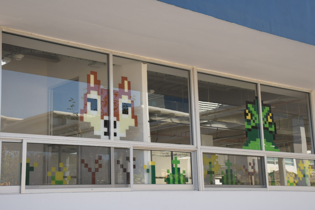 Alumnos de Diseño Gráfico intervinieron ventanales de los edificios EMA 1 y EMA 2 con obras en vinil inspiradas en el diseño, la tipografía y la biodiversidad de la región.