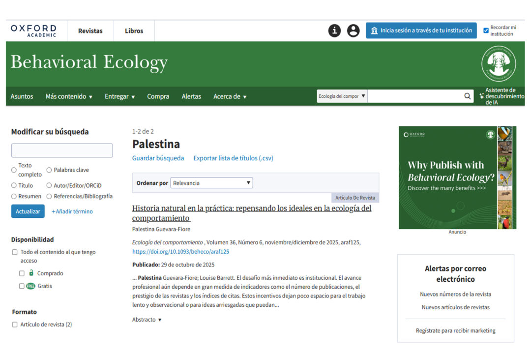 Behavioral Ecology es considerada una revista de cuartil uno (Q1) y su comité editorial está conformado únicamente por 12 especialistas de distintos países, lo que convierte este nombramiento en un reconocimiento de alto prestigio para la trayectoria académica de la investigadora universitaria.